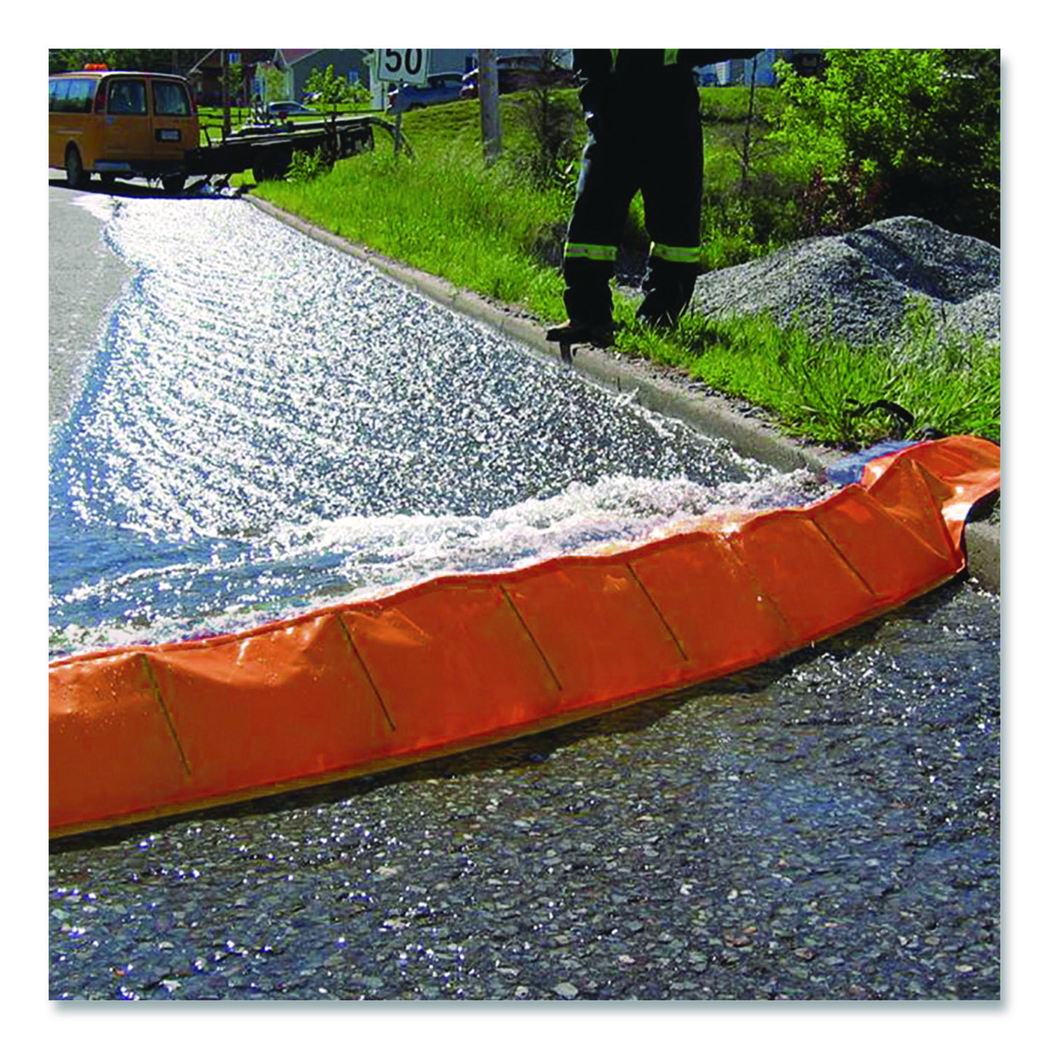 Quick Dam Water Force is a portable self-rising barrier that contains and controls flood water. Simply roll it out in desired location and watch it rise with the flow of oncoming water. Height: 6″; Length: 30 ft; Width: 24″; Color(s): Orange.