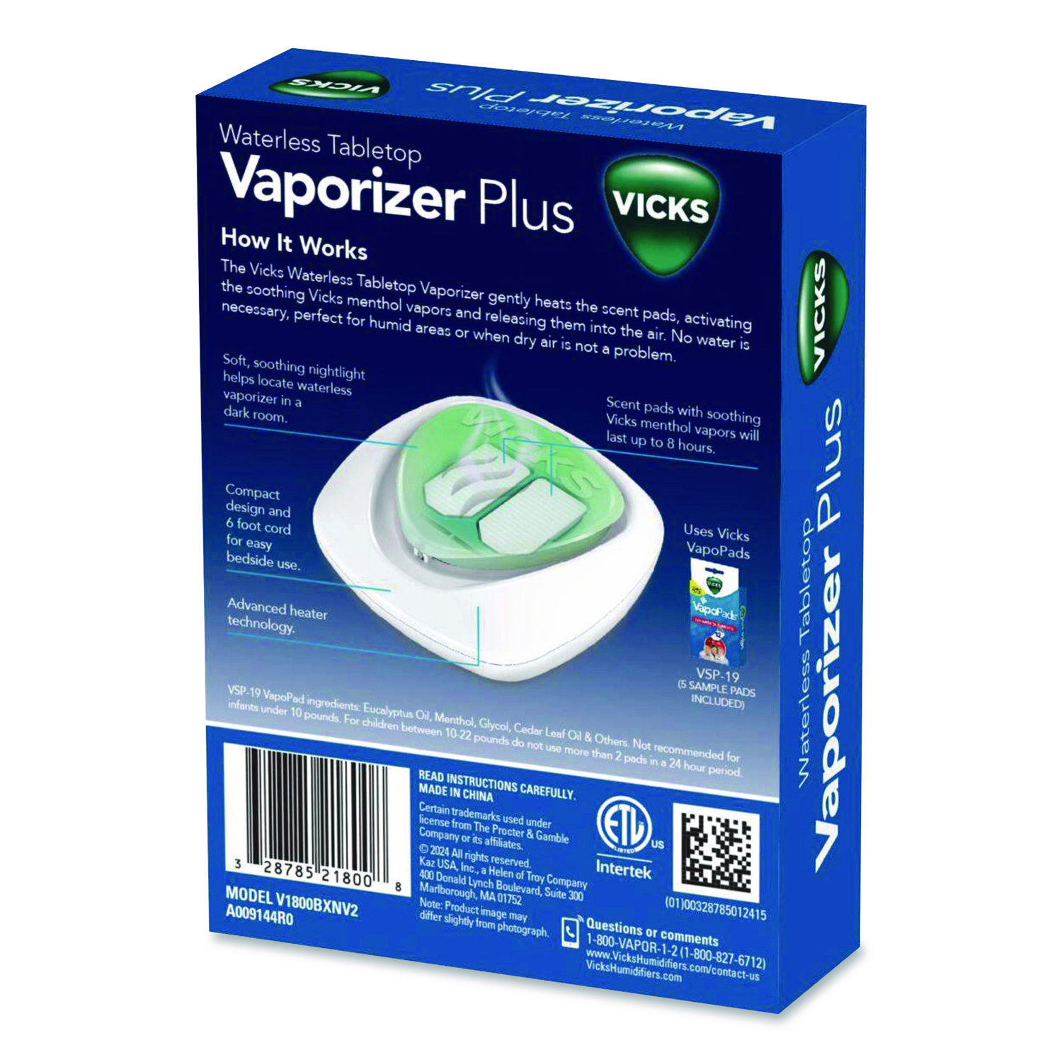 Experience the comforting power of Vicks® Advanced Soothing Vapors with this Waterless Tabletop Vaporizer Plus. This innovative device releases soothing menthol vapors without the need for water, making it convenient and mess-free. Simply plug it in and let the adjustable intensity control create a soothing environment to help relieve congestion and ease breathing. Enjoy the calming effects of Vicks® vapor therapy anytime, anywhere with this waterless vaporizer. Maximum Run Time: 8 h; Color(s): White/Mint Green; Cartridge/Other: Vicks® VapoPads Series VBR5, VSP19, VSP29, VSP30, VSP39; Maximum Room Size: 50 sq ft.