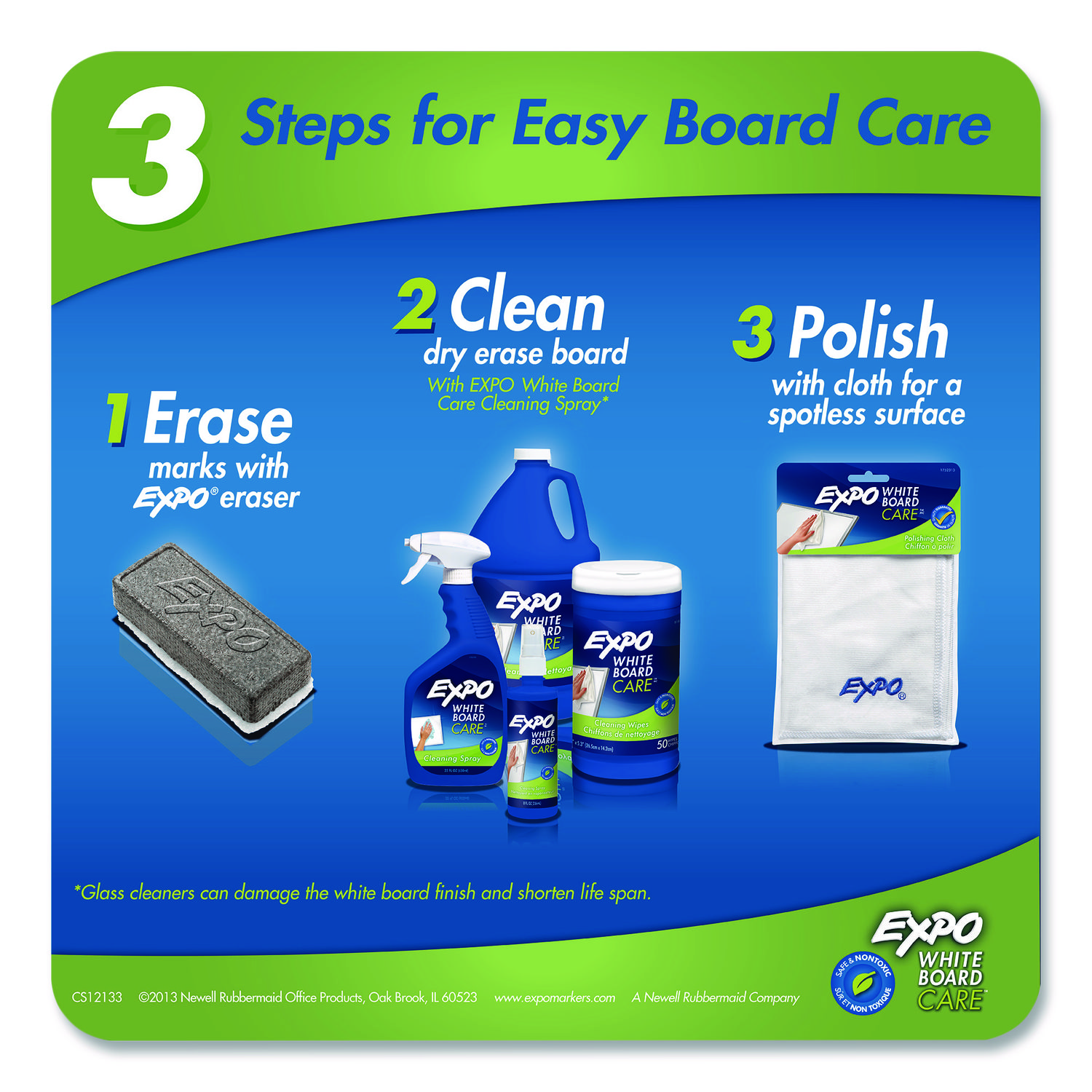 Nontoxic formula makes this ideal for classrooms and conference rooms. Easily cleans and refreshes whiteboards—just spray and wipe with a soft cloth. Application: Dry Erase Board Cleaner/Conditioner; Applicable Material: Aluminum; Ceramics; Enamel; Fiberglass; Laminates; Melamine; PET; Steel; Dirt Types: Dry-Erase Inks; Shadows; Stains; Scent: Unscented.