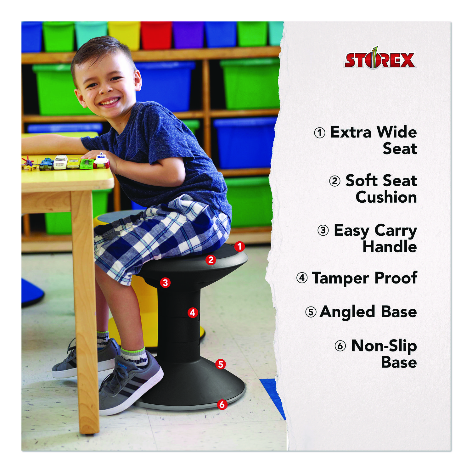 Featuring an adjustable seat height of 12″ to 18″ in 2″ increments, these wiggle stools grow with your students and eliminate guesswork when ordering. An extra-thick padded seat allows for comfortable all-day use. The tamper-proof adjustable height reduces distractions and help promote a focused environment. The rubberized non-skid base is angled for improved posture and provides stability, even when over-tipped. Recommended Application Area(s): Active Seating; Classroom & Training; Office & Task; Seat Color: Black; Color Family: Black; Arms Included: No.