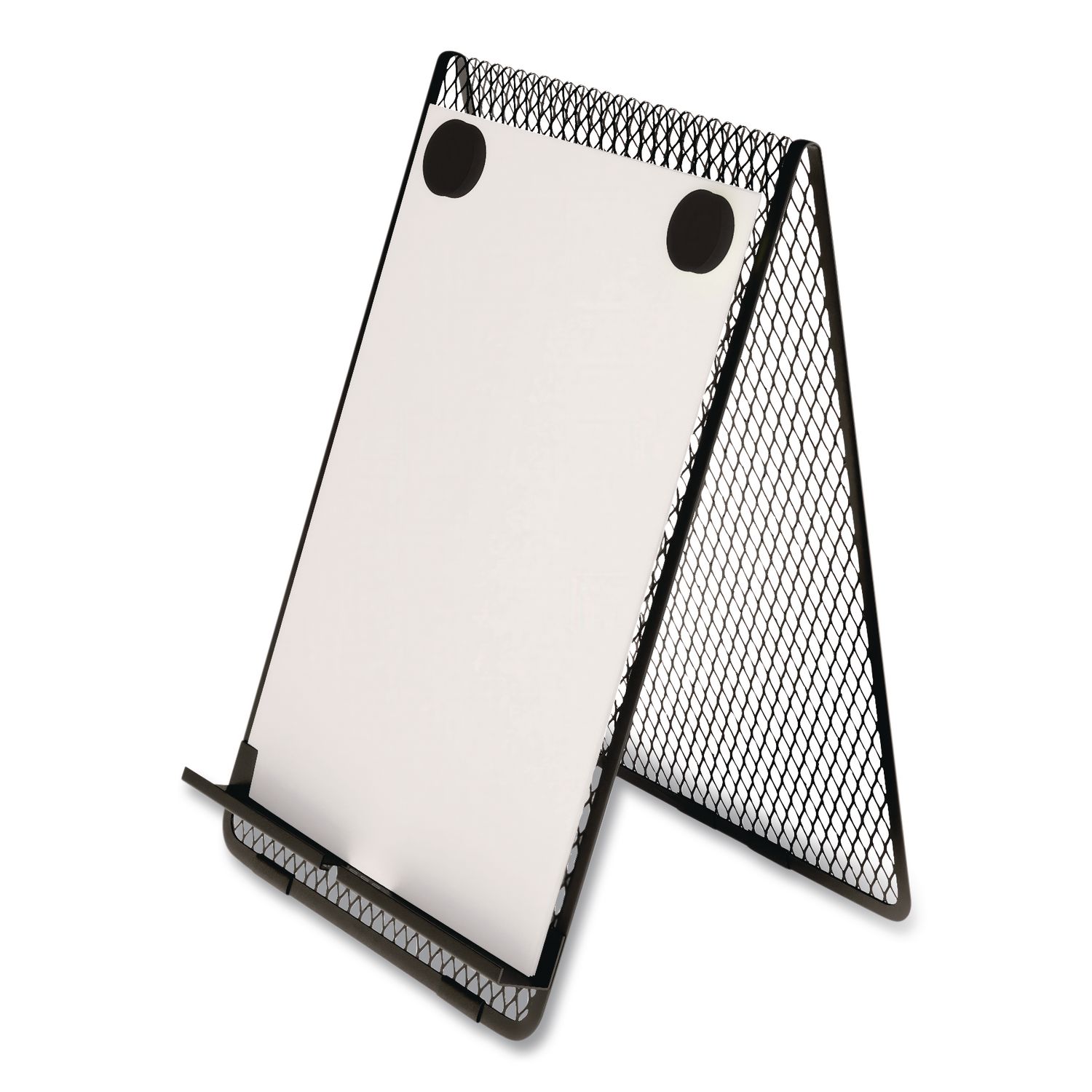 Keep contracts, reports and other important paperwork visible as you work. Angled design lets you view paperwork and screens at a glance. Integrated slot makes it easy to use and charge your tablet or smartphone. Included magnets hold pages securely in place as you look up figures or type out forms. With flat rounded edges, this mesh document holder offers a contemporary look. Document Size: Letter; Copy/Line Guide: No; Color(s): Black; Color Family: Black.