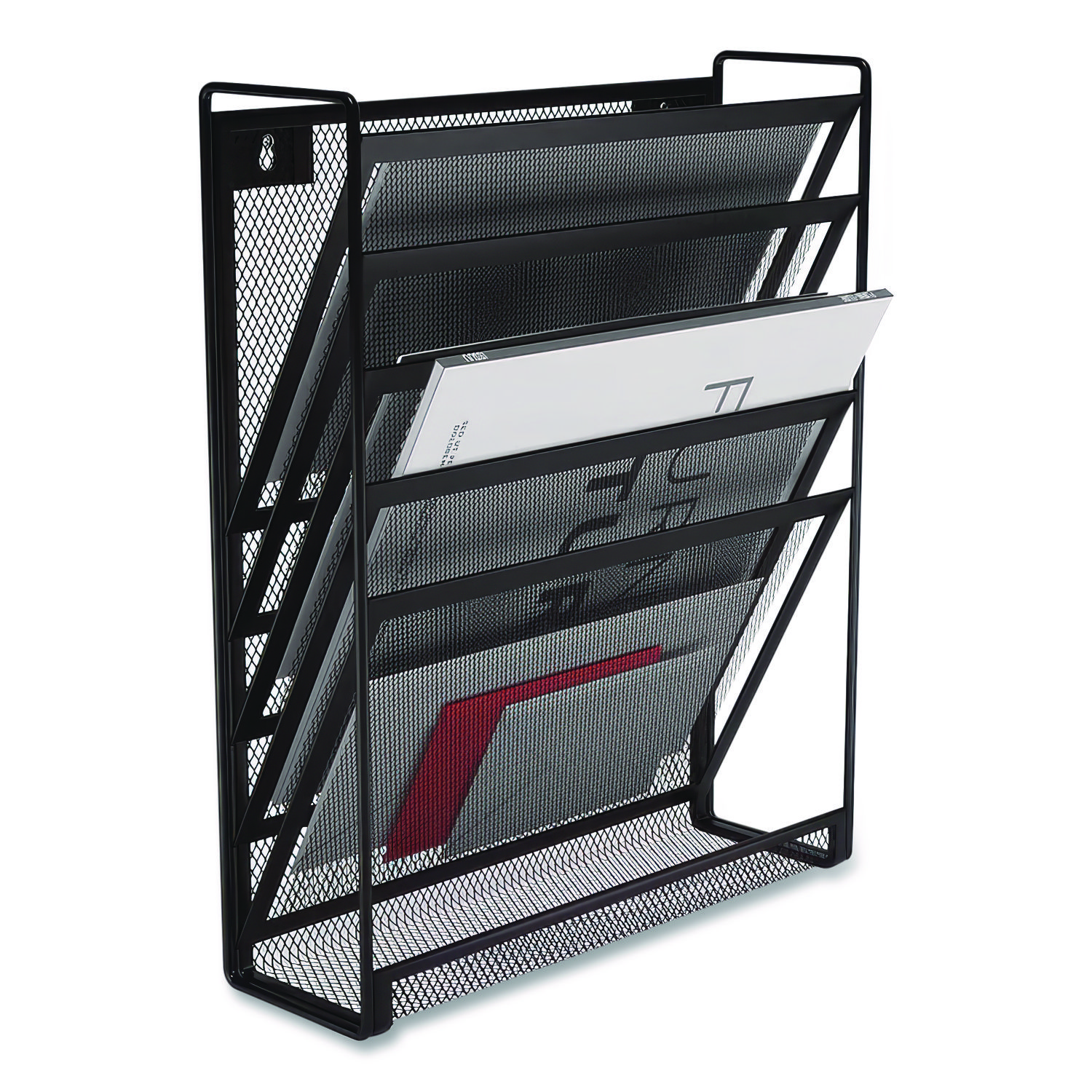 Reduce clutter and improve the overall appearance of your workspace. Inclined design and staggered openings accommodate paper pads, file folders, forms, documents and large-format envelopes. Tightly woven metal-mesh body and a sleek, flat-square frame with rounded edges deliver reliable performance with a contemporary, professional flair. Enclosed Design—Versatile placement options: mount to a wall or place directly on a worksurface. Number of Compartments: 5; For File Size: Letter; Load Orientation: Top; Color(s): Matte Black.