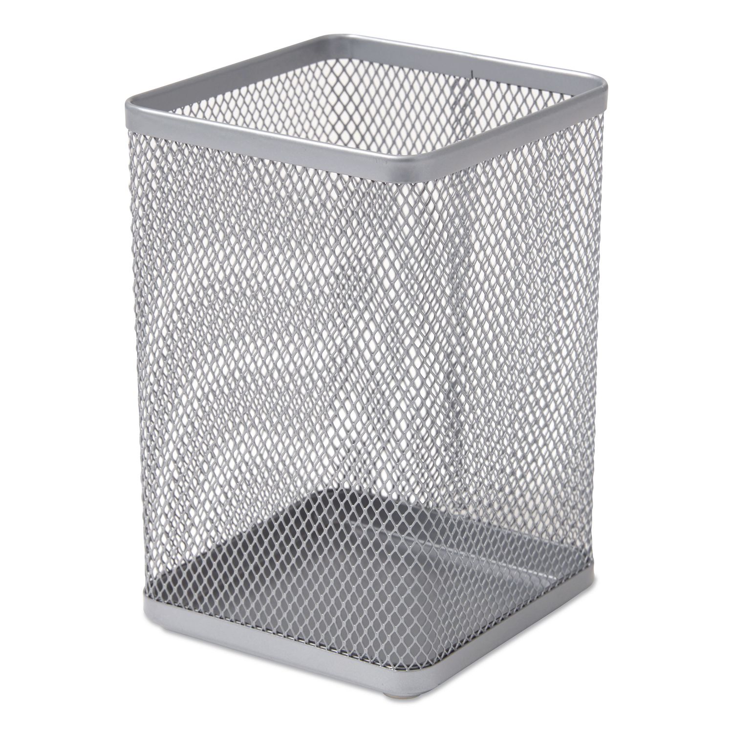 Keep your workspace organized. Single compartment keeps writing utensils and small office tools in one central location. Square design with flat rounded edges gives your desktop a contemporary look. Features tightly woven mesh construction for added durability. Jumbo Size. Pencil Cup Type: Wire Mesh; Color(s): Silver; Color Family: Silver; Material(s): Wire Mesh.