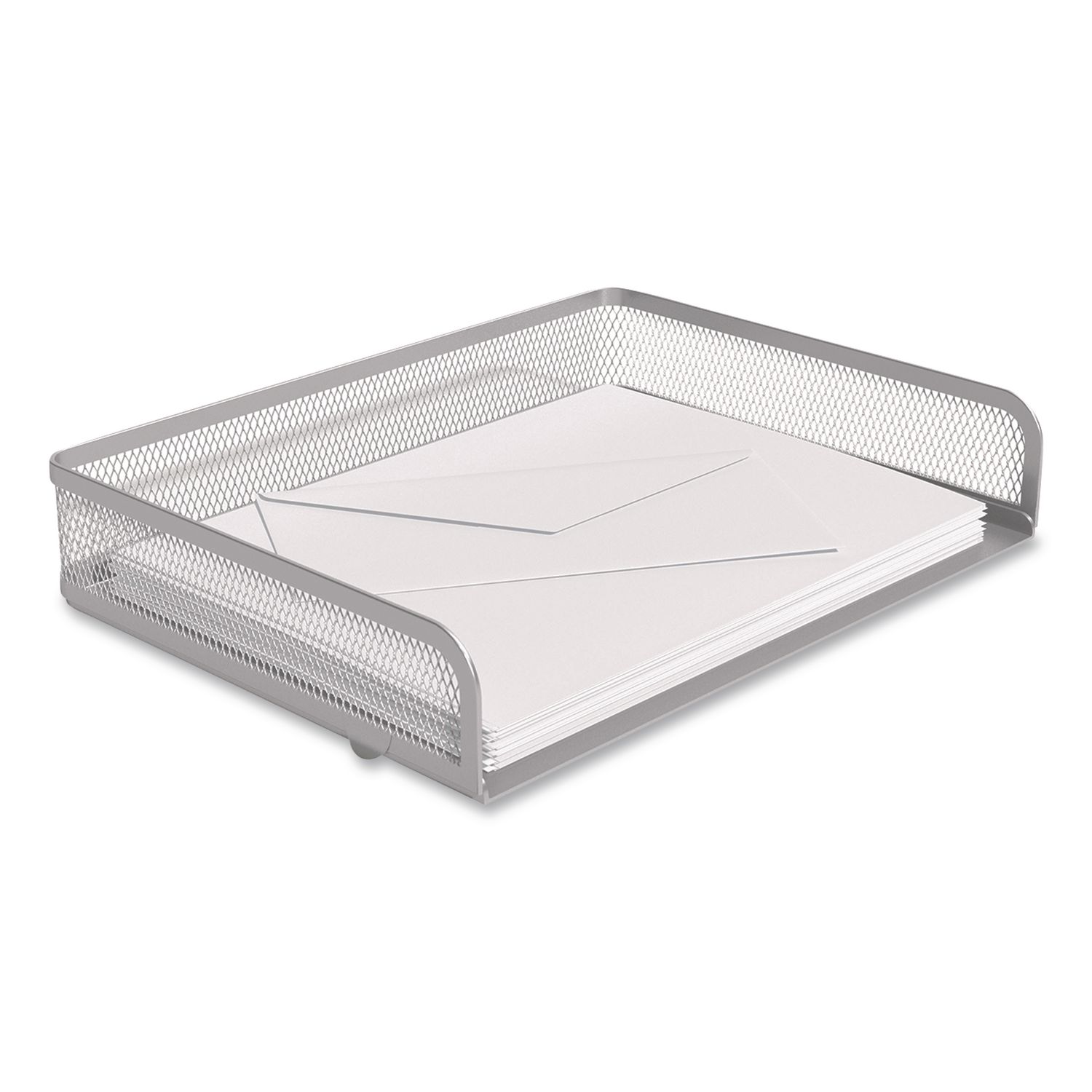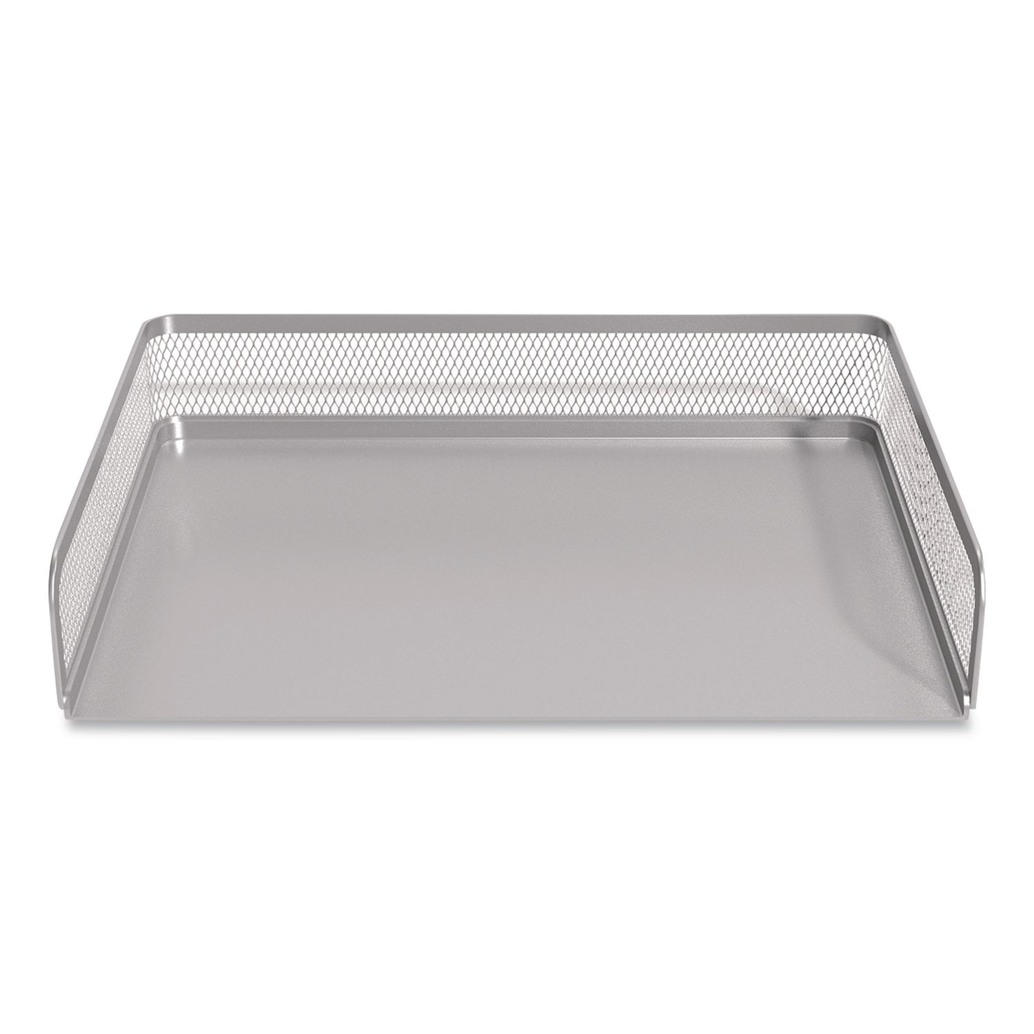 Create a customized organization system with this letter tray. Flat square-rounded edges bring a sleek look to your workspace, while the vertical stacking design allows for a more personalized setup. This side-load silver-colored mesh tray features a metal base for durability and feet to protect against desk scratches and slipping. Number of Compartments: 1; For File Size: Letter; Load Orientation: Side; Color(s): Silver.