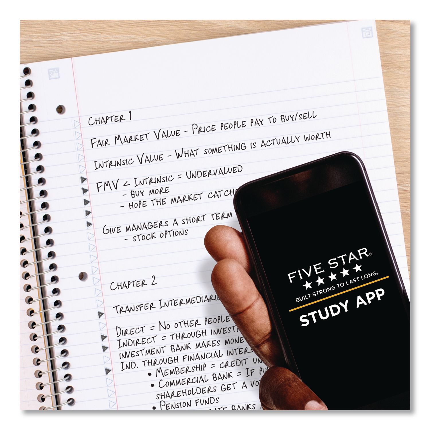 Lasts all year. Guaranteed! Durable, water-resistant poly covers protect your notes all year. Reinforced, tear-resistant divider pockets keep your loose sheets together. Spiral Lock® wire binding prevents coil snag, and high-quality paper provides excellent ink-bleed resistance. Easily inserts into any three-ring binder (sold separately). Scan, study and organize your notes with the Five Star Study App. Create instant flashcards and sync your notes to Google Drive to access them anywhere, from any device. Pocket Sized: No; Book-Binding Type: Spiral Coil; Book-Binding Edge: Side; Cover Color: Randomly Assorted.