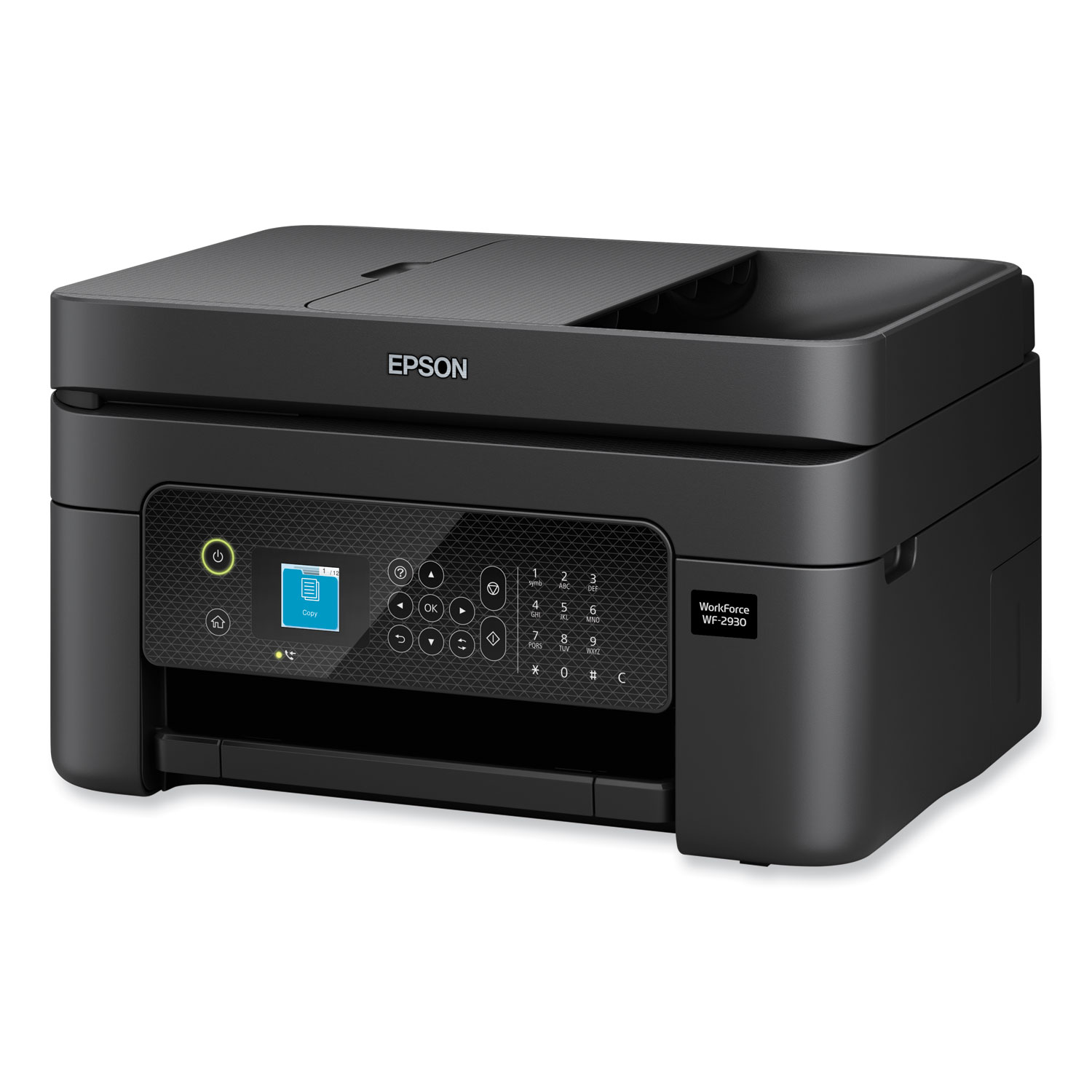 Enjoy hassle-free business printing with the WorkForce® WF-2930. An efficient, all-in-one solution, the WF-2930 streamlines workflow with a built-in scanner, copier, fax and Auto Document Feeder. Perfect for printing presentations, contracts and corporate graphics, as well as occasional prints for the home or family, it features Epson’s industry-leading printing technology to consistently deliver documents with sharp text and vivid colors. Plus, with effortless setup and wireless connectivity, it’s the convenient choice for everyday home office printing. Machine Functions: Copy, Fax, Print, Scan; Printing Type: Inkjet; Maximum Print Speed (Black): 10 ppm; Maximum Print Speed (Color): 5 ppm.