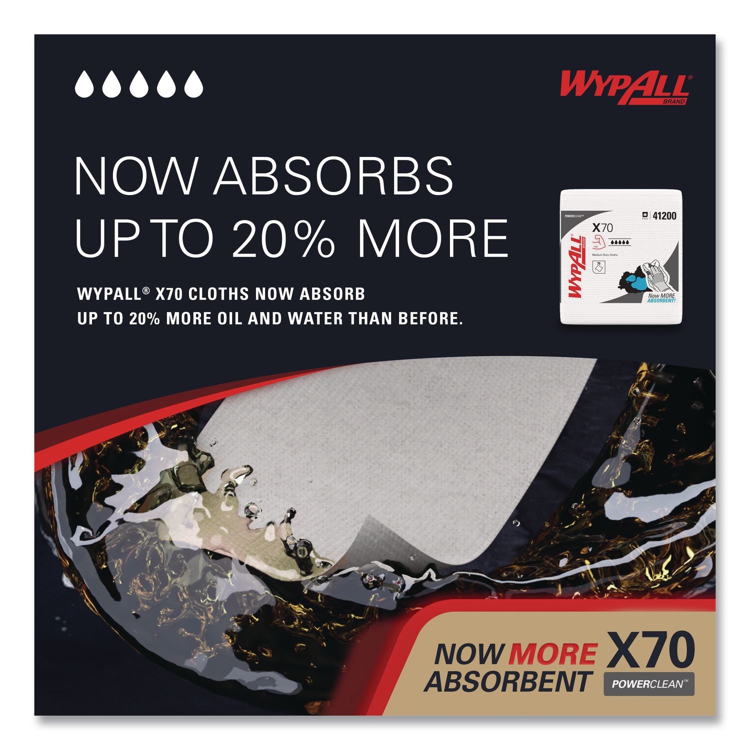 WypAll® is the number one brand of disposable wipes in the US and Canada. Maximize performance while minimizing time, effort and product waste. If you’ve been using either laundered shop towels or textile shop rags, it’s time to make the switch to WypAll® PowerClean™ X70 Cloths. The cloths are durable, absorbent industrial cloths featuring high-tech Hydroknit® material. WypAll® X70 cloths now absorb up to 20% more oil and water than before. In addition, Theys now feature a new cloth-like look and feel for enhanced absorbency, making them even more effective for your cleaning tasks. These medium duty cloths are made of soft pulp fibers, bonded to a polypropylene base sheet for absorbency and tear resistance, making them suitable for removing dirt, oil, grime and solvents in a variety of industrial and manufacturing industries. WypAll® X70 cloths are so sturdy that they can often be used more than once. (Once you’ve used them a few times, they’re disposable.) These premium industrial cleaning cloths are designed to clean surfaces and tools, making them a must-have for the HVAC, automotive, manufacturing and industrial industries. When you’re running a business, it pays to use the very best supplies. Trust the performance and innovation of WypAll® PowerClean™ X70 Medium Duty Cloths today. Quarterfold. Towel/Wipe Type: Folded Cloths; Fold Types: Quarter-Fold; Material(s): Hydroknit; Color(s): White.