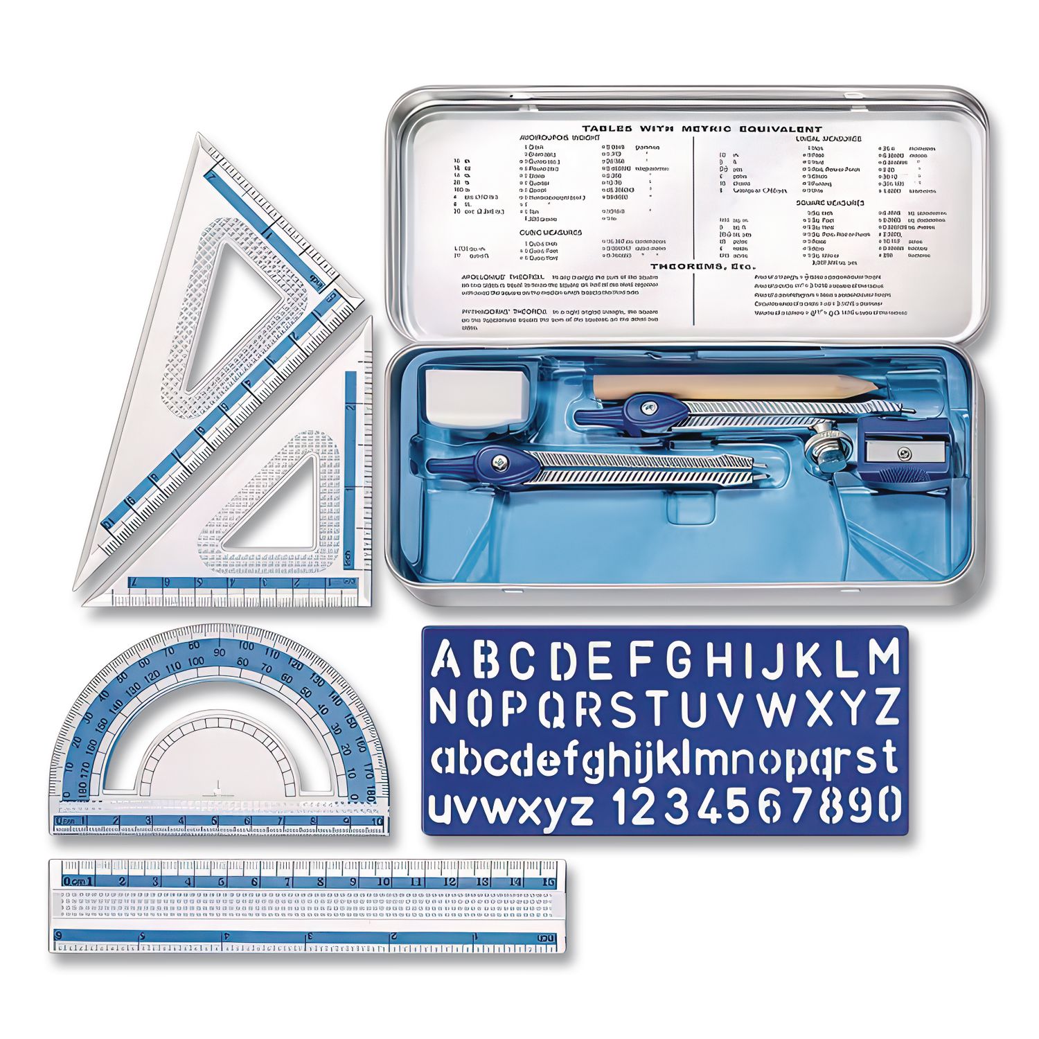 Everything needed for higher-math classes—this precision instrument set is ideal for serious high-school and college students. Includes a standard/metric ruler, a 180° protractor, a 60° set square, a 45° set square, a safety-point scribe compass, a set of loose-leg wing dividers, a woodcase pencil, a pencil sharpener, a block eraser and a lettering guide. Handy metal storage case features imprinted conversion tables and geometric theorems. Color(s): Clear/Blue; Material(s): Plastic; Ruler Type: Standard/Metric; Standard Scale: 1/16″.