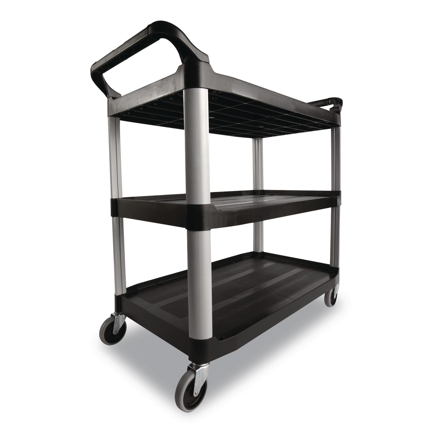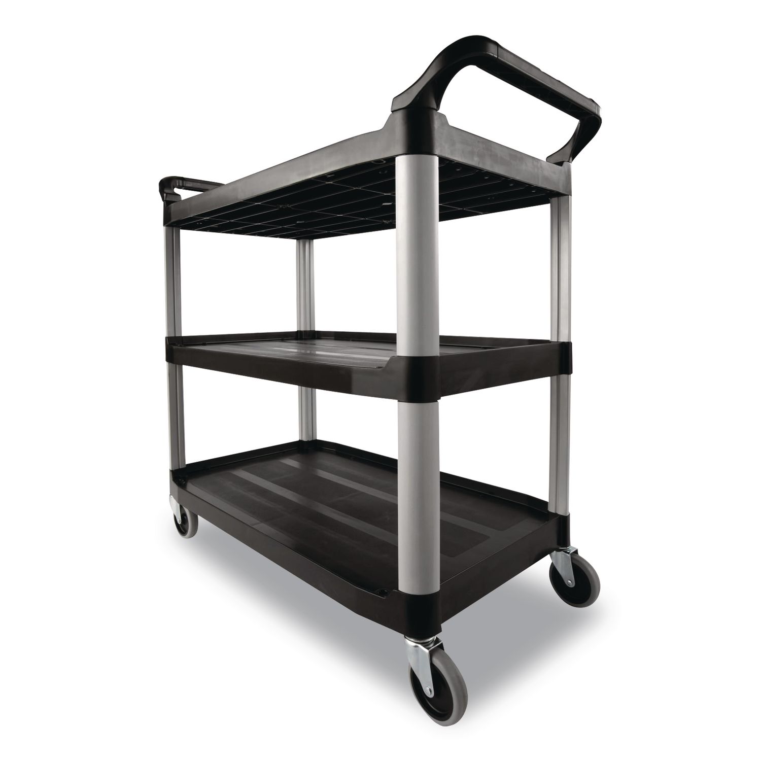 Sized to carry large loads and reduce return trips, Xtra™ Utility Carts are ideal for both front and back of house food-service applications, from kitchen food-prep tasks to table service. Metal uprights and durable, structural web body resist scratches, chips and rust. Fully open shelf design with easy-to-clean surfaces ensures easy loading and unloading. Lightweight and easy to maneuver with comfortable, easy-grip handles and quiet, nonmarking 4″ swivel casters. Each shelf supports up to 100 lb. Material(s): Plastic; Overall Material Type: Plastic; Color(s): Black; Color Family: Black.