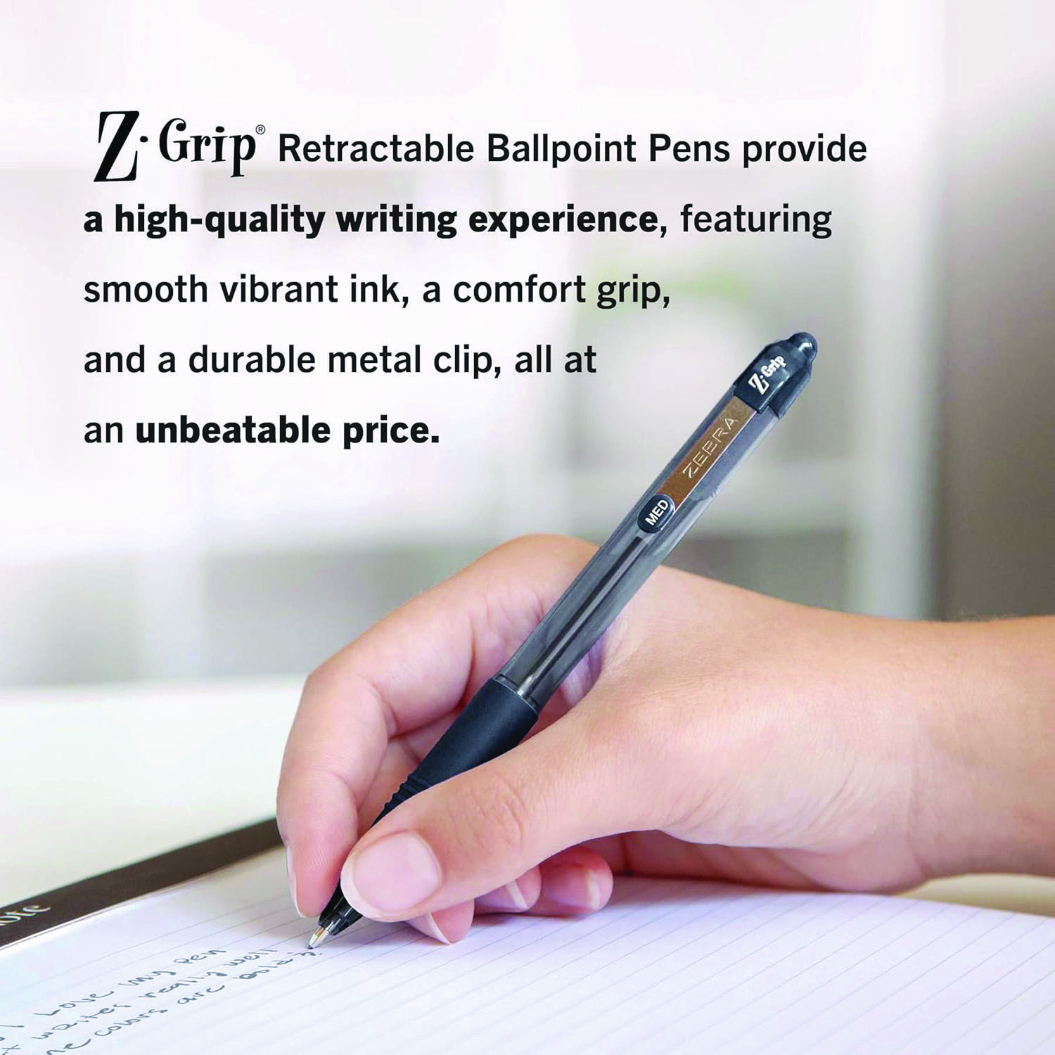 Looking for an everyday tool that doesn’t look or perform like one? The Z-Grip Ballpoint Retractable Pen delivers on all fronts: value, performance, comfort, and style. There’s no need to compromise on any of the attributes you like in your pens as the Z-Grip Retractable Ballpoint Pen features silky smooth easy-glide ink for a skip-less writing experience, a comfort ridged grip and a pocket clip for durability. Housed in a plastic barrel with a fun, fashionable look and retractable design, this ballpoint pen is the perfect choice for your home, school, workspace, small business, or traditional office. You’ll feel the difference when you write, but not at the cash register. Pen Sub-Brand & Product Family: Z-Grip®; Pen Type: Ballpoint Pen; Pen Style: Retractable; Pen Tip Type: Conical.
