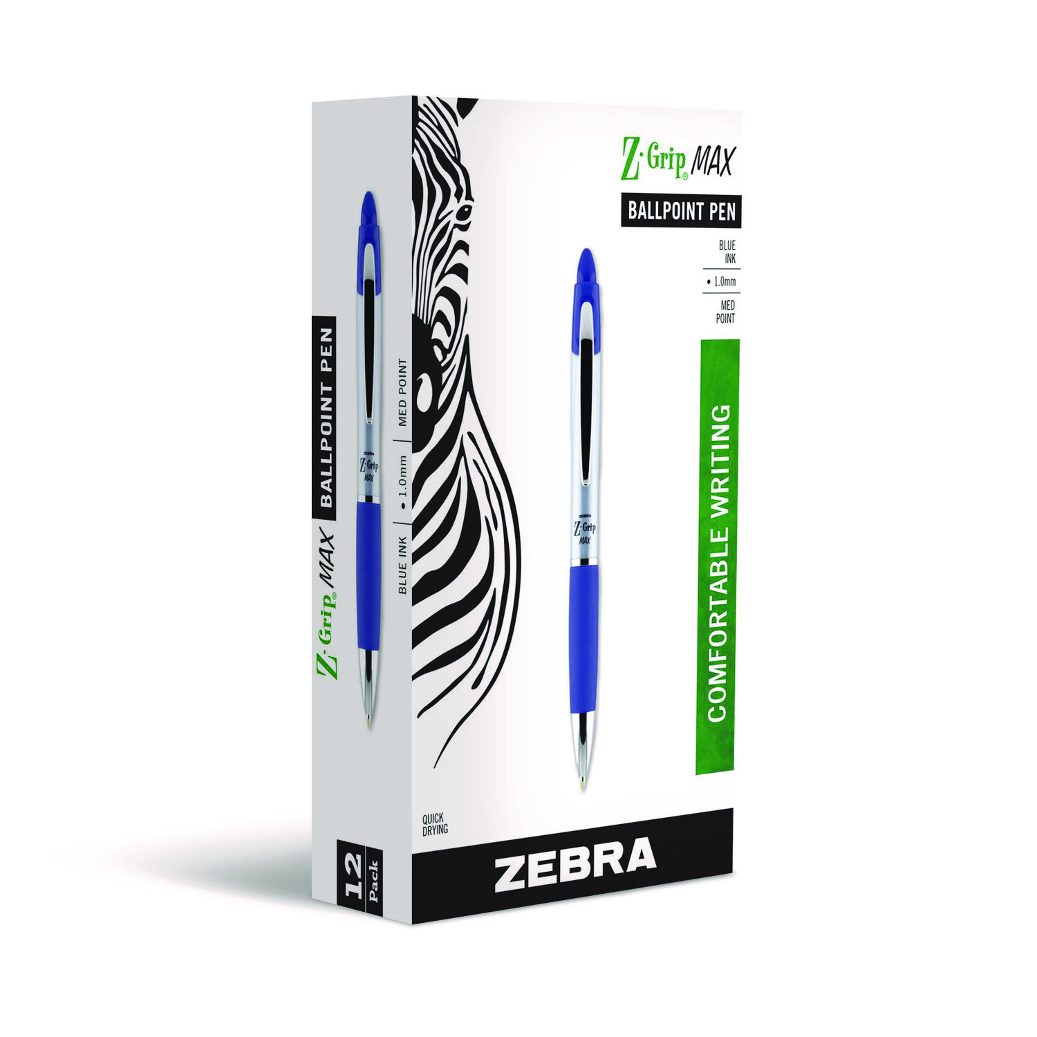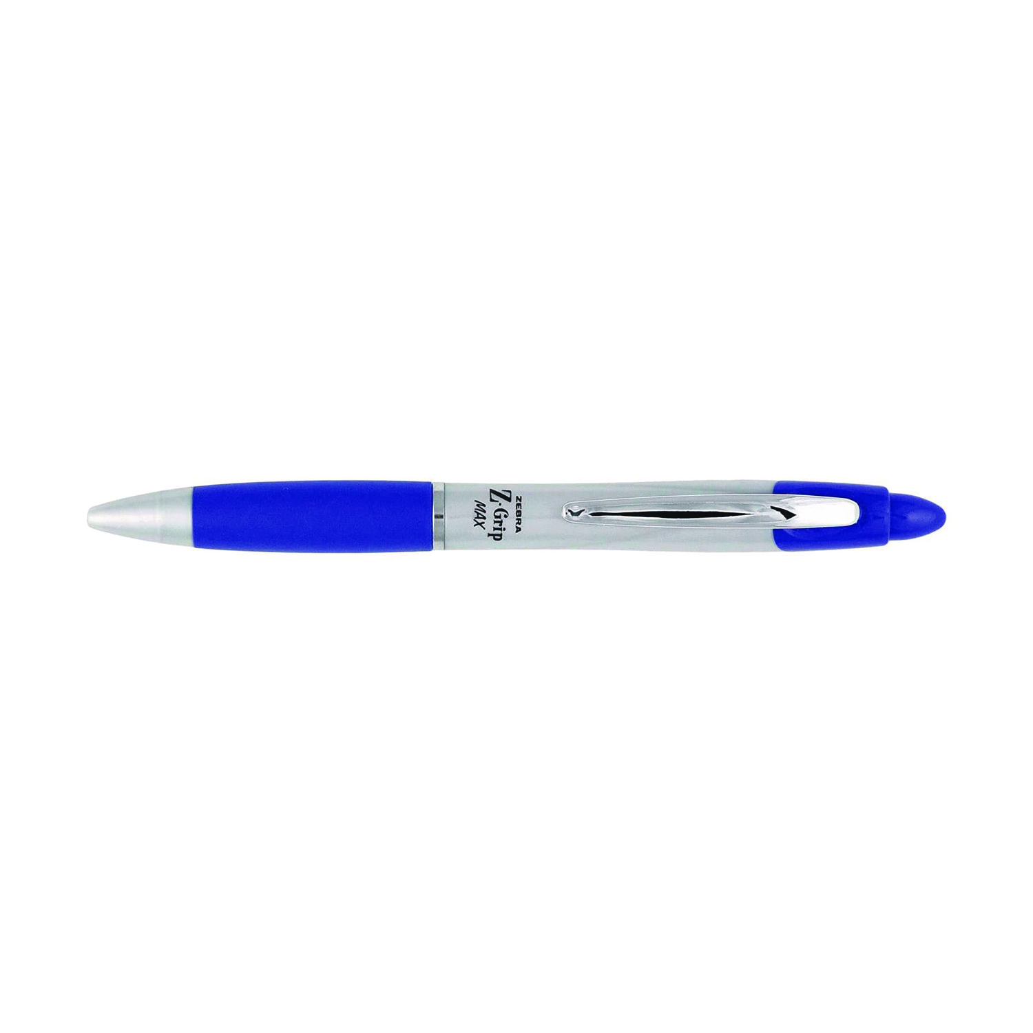 Give your hand a break. Zebra® Pen’s Z-Grip MAX Retractable Ballpoint Pen helps you take notes and endure long writing sessions in comfort. Easy-glide ink means a skip-free writing experience. Upgrade your office pens with cost-effective, reliable retractable pens. Provides top-of-the-line performance for home, school and office. Features a wider barrel for an easier grip, helping reduce the pressure that leads to writer’s cramp. Soft rubber grip and plunge match the ink color so you can find the pen you need at a glance. Enjoy a wonderful ergonomic experience. Economical and reliable, rich ink makes this pen a trusted choice for meeting minutes, homework, note-taking, and more. Metal clip provides a secure clasp onto notebooks, journals and pockets. Silver barrel elevates this trusted ballpoint with executive style. Pen Sub-Brand & Product Family: Z-Grip® MAX; Pen Type: Ballpoint Pen; Pen Style: Retractable; Pen Tip Type: Conical.